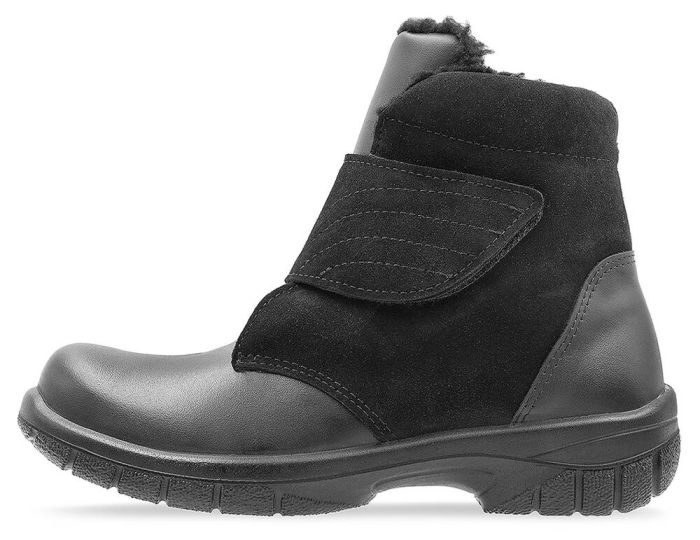 Lämpimät talvinilkkurit tilavalla XL-lestillä. Leveän tarrakiinnityksen ja venykkeen avulla nilkkurit ovat helppo pukea jalkaan. Päällinen kestävää pintanahkaa ja haljasnahkaa, jotka on käsitelty vettä ja likaa hylkiväksi. FlexStep®-joustopohja pysyy joustavana myös pakkasella. Paksu villateddyvuori yhdessä irrotettavien Thermo ALU -pohjallisten kanssa pitää jalat lämpiminä.